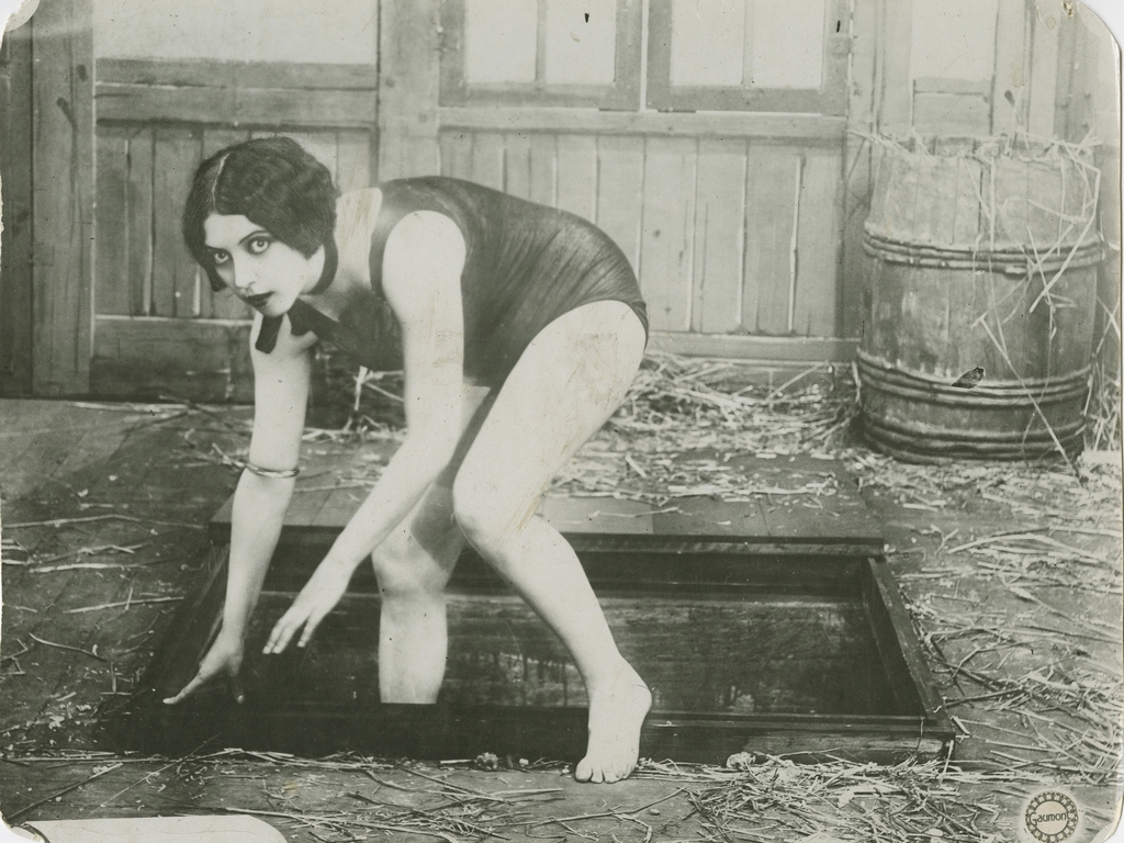 What is she? asks André Breton and Leona Delcourt’s Nadja. And Jacques Rivette’s Céline et Julie. Or we could have borrowed our title from Max Ernst’ La Forme de tes yeux ne m’apprend pas à vivre (1925). What is Musidora? Let us attempt an answer, let us drape the Cineteca’s three entrances in her colours: let us cover them in posters, in photographs (many of them strikingly unusual), in pen-and-ink drawings, in private correspondence, in contemporary reviews and unexpected objects. In other words, in no particular order: those fascinating eyes, the lasting image of a black body-stocking, Gaumont’s vamp, the surrealist muse, and also her first steps (Académie Julian, Cinéma du Peuple, cabaret and music-hall memorabilia), the Spanish fiesta of the Musidora Film Company productions and her pioneering archival work at the Cinemathèque française (correspondence, inventory, lecture, Commission des recherche historique).