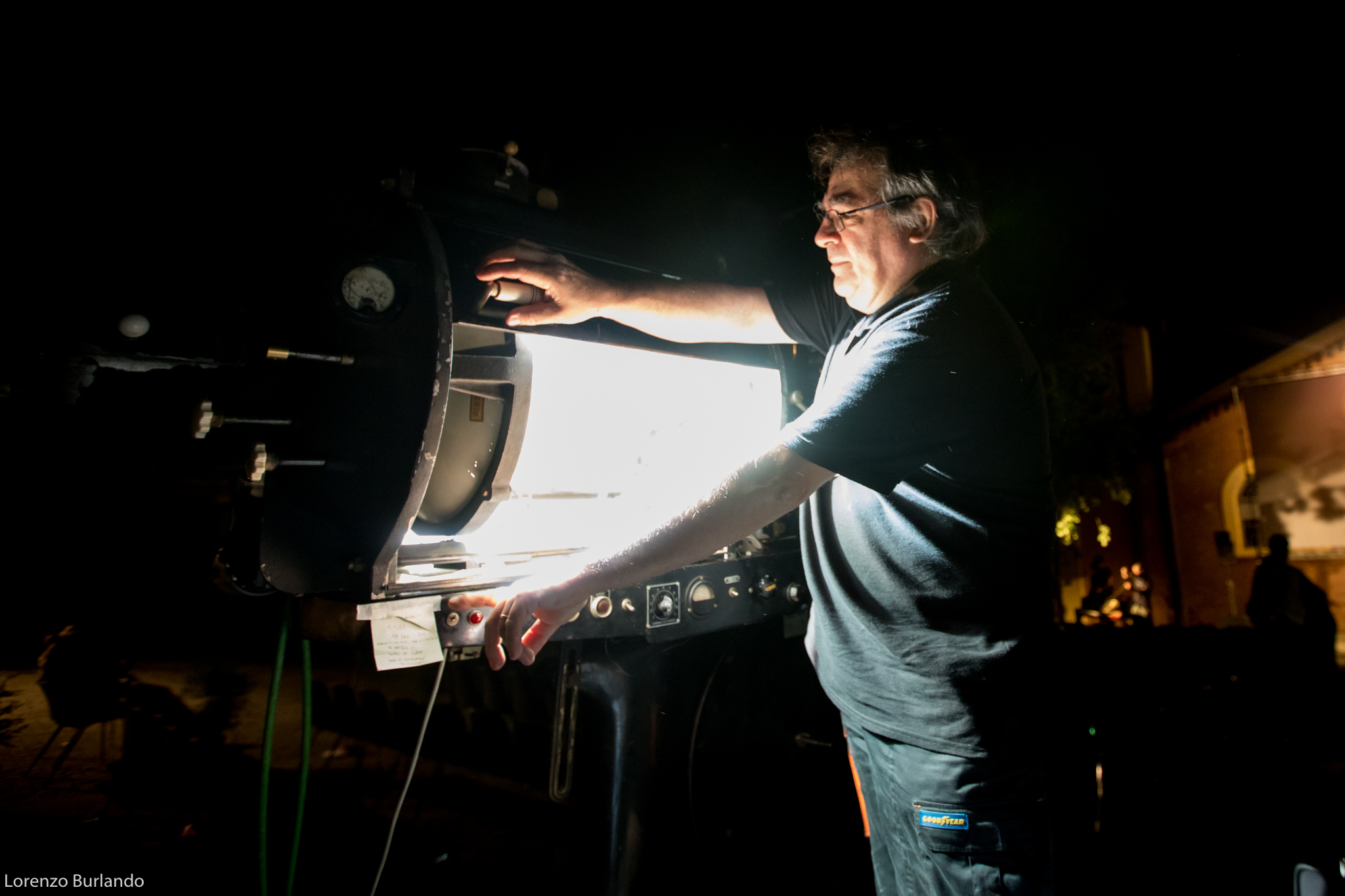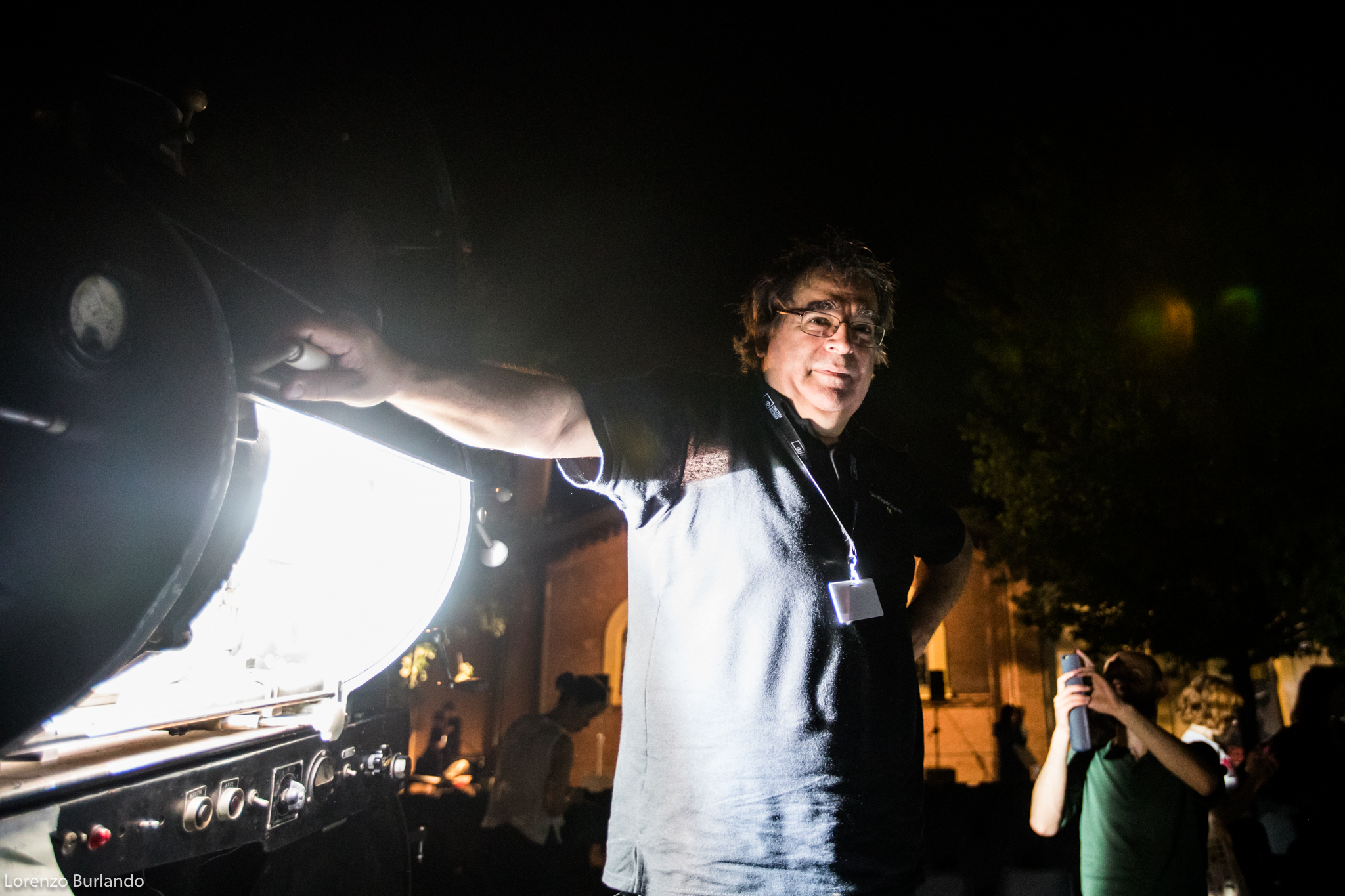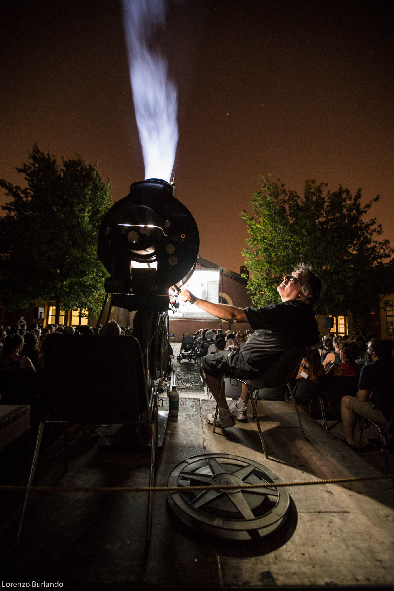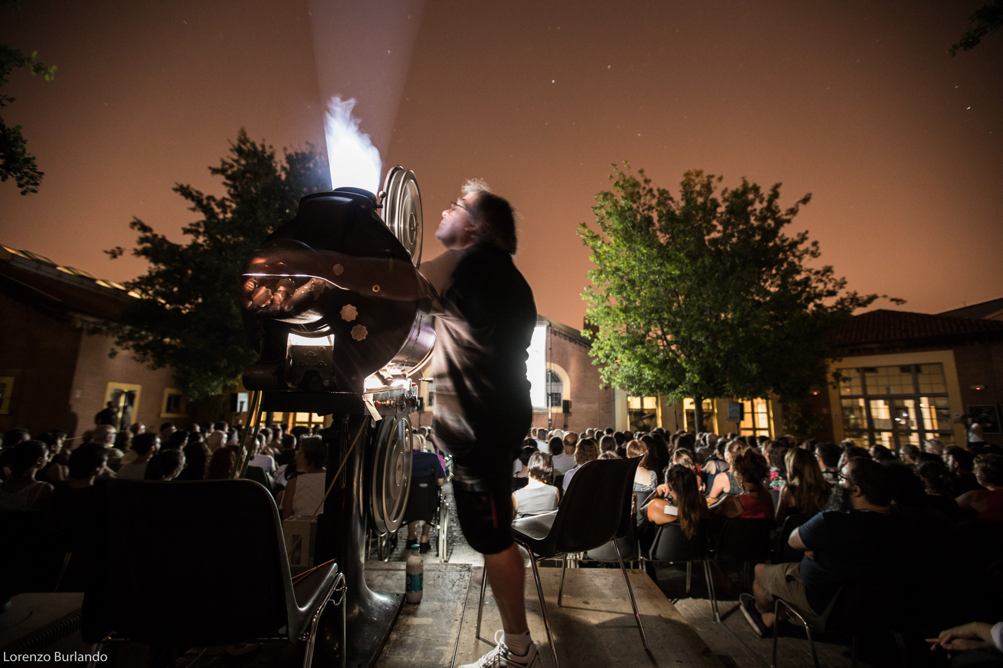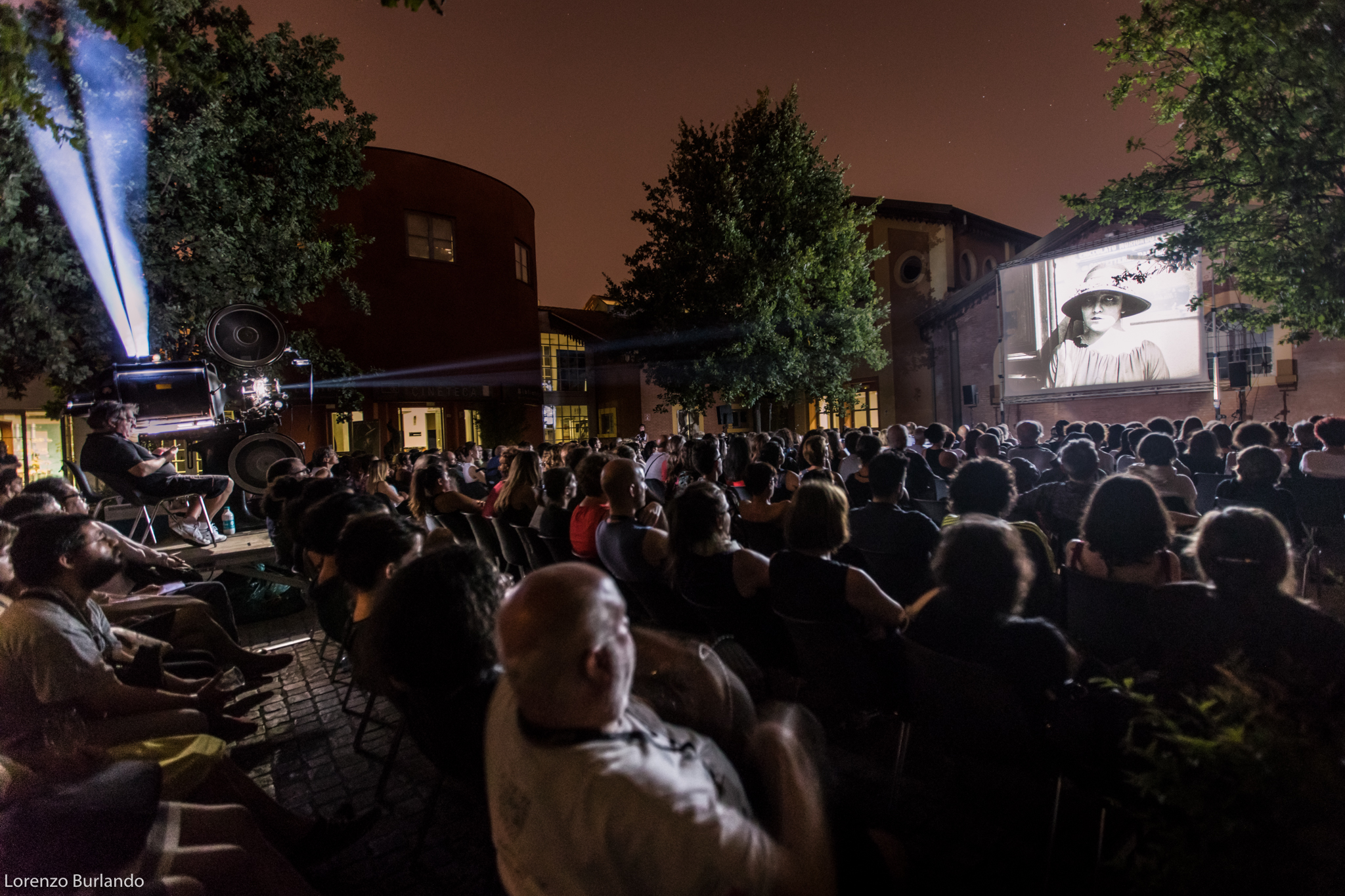 La lunga giornata di giugno si è finalmente decisa a lasciare spazio alla sera, le ombre di rami e foglie hanno smesso di danzare sullo schermo che da bianco si è fatto nero, pronto a ricevere bagliori antichi e dare in cambio stupore. E’ la sera più magica, la più attesa dal cinefilo nostalgico e gli ingredienti per un’esperienza multisensoriale ci sono tutti: la dimensione è quella intima di piazzetta Pasolini, fra le architetture fine Ottocento dell’antico mattatoio cittadino e la musica dal vivo, arredi vintage e vecchi bauli adornano la zona aperitivo (o forse dovremmo dire zona ristoro che fa più rétro) e poi c’è lei, la signora della piazza che di giorno si ripara dal sole sotto al suo personale gazebo come una dama d’altri tempi farebbe con l’ombrellino. Tutti la guardano, la fotografano, la riprendono, ‘la nonna’ la chiama affettuosamente chi la conosce come Stefano Bognar, il proiezionista che da quarant’anni accudisce con amore la maestosa lanterna a carbone della Cineteca che per tre serate renderà unica l’esperienza del Cinema Ritrovato. Le ore passano e la piazza la corteggia, la studia timida e si chiede che effetto farà; la sala a cielo aperto si riempie in fretta e il silenzio si fa fitto, quasi religioso mentre l’allegria conviviale dell’aperitivo lascia spazio alla magia del passato che ritorna. E’ la prima sera e per il debutto ‘la nonna’ ha scelto Addio giovinezza! di Augusto Genina (1918). Via i telefoni, via le telecamere, stasera non c’è spazio per le tecnologie e il digitale, solo il rumore ritmico della griffa e il piccolo mondo dell’amore struggente di Mario e Dorina saturano l’aria insieme ai fumi dei carboni e alle note del trio di Daniele Furlati. A vegliare sul sogno collettivo della piazza c’è lui, il genovese Bognar, proiezionista dall’età di 14 anni, sì proprio come Totò Cascio in Nuovo cinema Paradiso, da bambino cacciato a pedate dalle sale di proiezione e oggi ancora con la sua bottiglia di latte a portata di mano perché “una volta i proiezionisti – racconta – avevano diritto per contratto nazionale a mezzo litro di latte al giorno… respirare i fumi dei carboni non era molto salutare”. Lui è lì che vigila affinché l’incanto non si spezzi. “Il proiettore vecchio, il film muto, il fumo che esce… questo è il fascino. Questo è il cinema”.