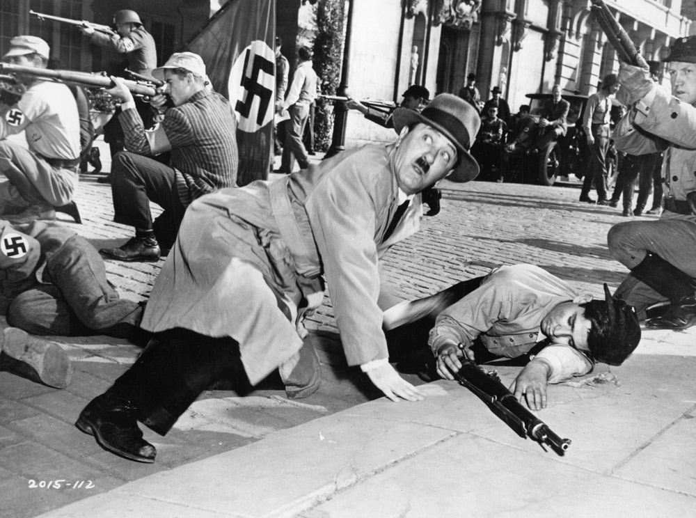Dopo il 1940, la travolgente interpretazione di Chaplin resterà inimitabile e comprensibilmente nessuno vorrà osare tanto. Entriamo nel periodo delle trame fantastiche con The Strange Death of Adolf Hitler di James Hogan (1943) e The Magic Face di Frank Tuttle (1951): il primo fu girato quando Hitler era ancora vivo, e ci guadagna in attualità e tensione. Quegli anni produssero sia film che fantasticavano un’eliminazione di Hitler (genere inaugurato da Man Hunt di Fritz Lang, che si apre con il protagonista che inquadra Hitler nel mirino del suo fucile), sia grandi seppur assurde impersonazioni, come in The Hitler Gang (John Farrow, 1944) dove una buona interpretazione di Hitler è completata da un gruppo di individui dai volti patibolari, i gangster nazisti. I migliori sosia, però, vengono dalla Russia: come nella deliziosa fantasia diretta da Sergej Jutkevič, The New Adventures of Svejk, e in alcuni corti che esprimono l’energia creativa di cui fu capace quel misto sovietico di arte e propaganda che fiorì durante la guerra. (La mancanza di spazio ci impedisce purtroppo di proiettare la folle epica di Michail Čiaureli, Fall of Berlin, 1949, che ci offre non solo Hitler ma anche – quale vero protagonista di un film formidabile – Stalin nella celeberrima interpretazione di Michail Gelovani).