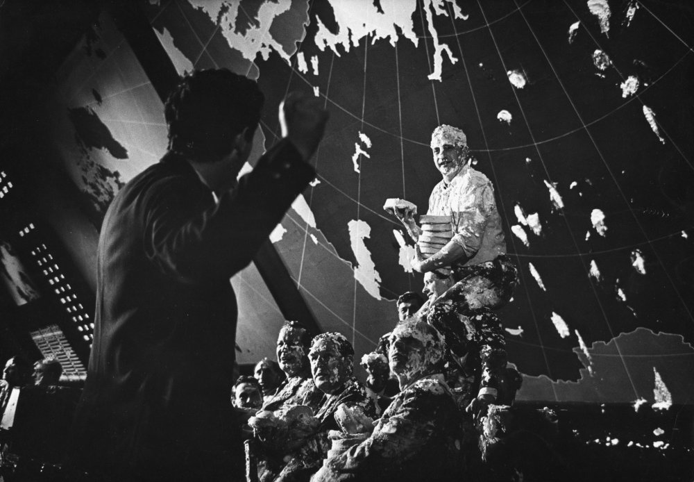 Originariamente Il dottor Stranamore avrebbe dovuto concludersi con una battaglia a torte in faccia in stile Keystone Cops, all’interno della “war room”, la magnifica stanza della guerra ideata dallo scenografo Ken Adam, ricostruita negli studi di Shepperton e ad oggi considerata “uno degli esempi più eccezionali ed evocativi della scenografia cinematografica contemporanea” (John Baxter).