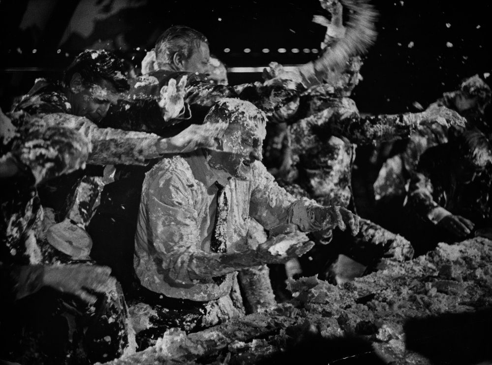 “Il dottor Stranamore si concludeva con Peter Sellers, il presidente degli Stati Uniti, ed io seduti sul pavimento, mezzi sprofondati nelle torte di crema, che facevamo castelli cantando ‘For he’s a jolly good fellow’ [Perché è un bravo ragazzo, NdT], e il buon tizio in questione era il sinistro Dr. Strangelove. Questa sequenza venne girata per quasi due settimane e dovette costare diverse centinaia di migliaia di sterline, ma al momento del montaggio Stanley decise che era completamente stonata rispetto al resto del film e, benché fosse straordinariamente divertente ed efficace, decise di tagliarla. Ha dovuto soffrire molto prima di giungere a questa decisione, ma la sua integrità è tale che scommetto ebbe ragione” (I say look here, Peter Bull, 1965, estratto riportato in Kubrick, Michel Ciment, 1999).